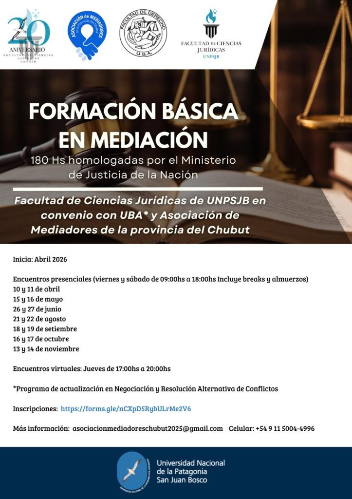 Esta actividad es organizada en forma conjunta por la Facultad de Ciencias Jurídicas de la UNPSJB y la Asociación de Mediadores de la Provincia del Chubut y dictada por docentes de la Universidad de Buenos Aires (UBA).