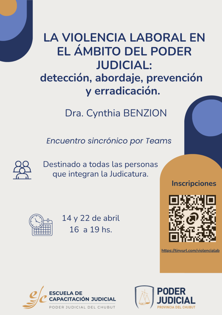 La Oficina de Violencia Laboral, dependiente de la Dirección de Recursos Humanos del Superior Tribunal de Justicia, junto con la Escuela de Capacitación Judicial, invitan a participar de la propuesta virtual sincrónica: La violencia laboral en el ámbito del Poder Judicial: detección, abordaje, prevención y erradicación.