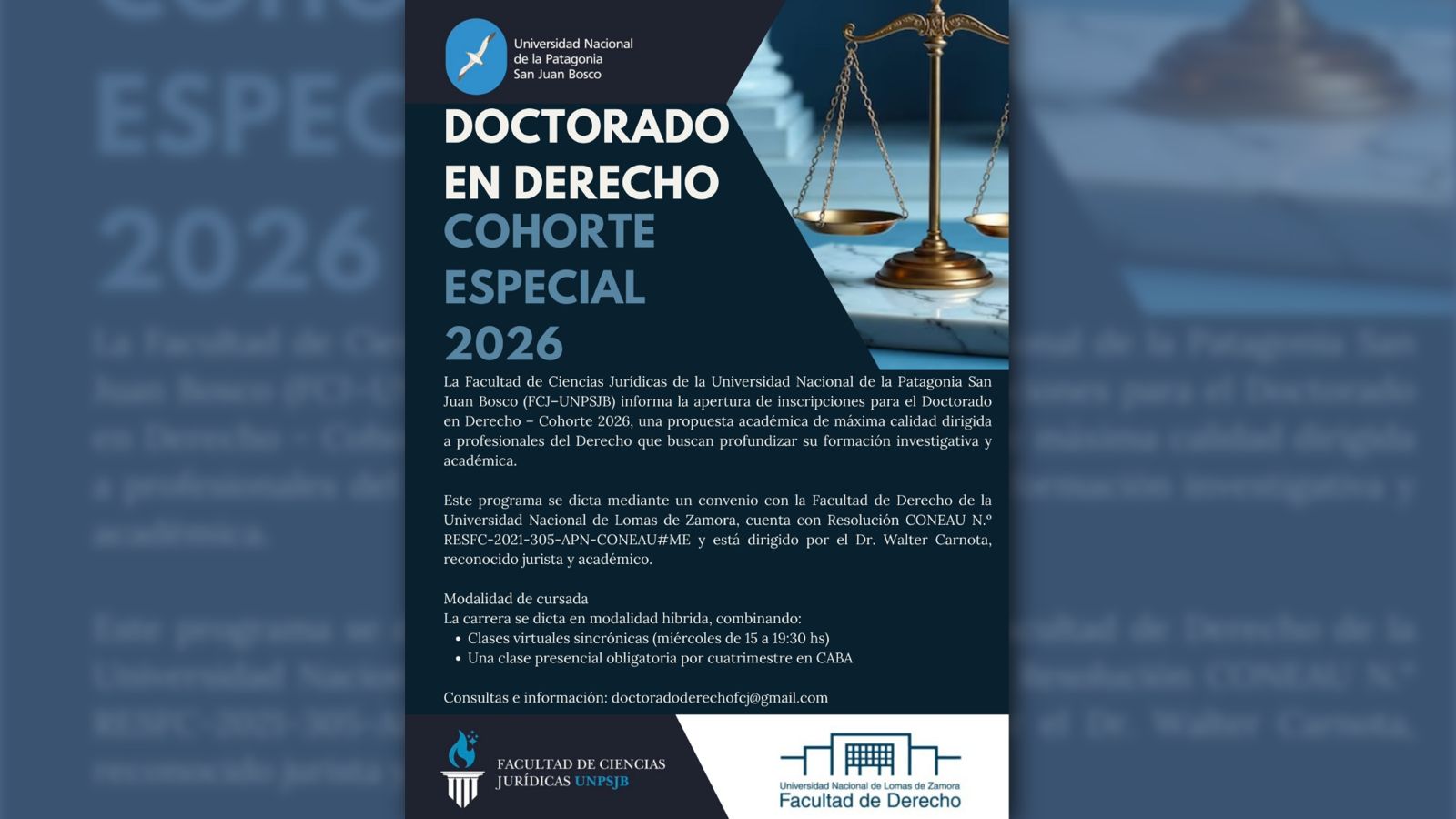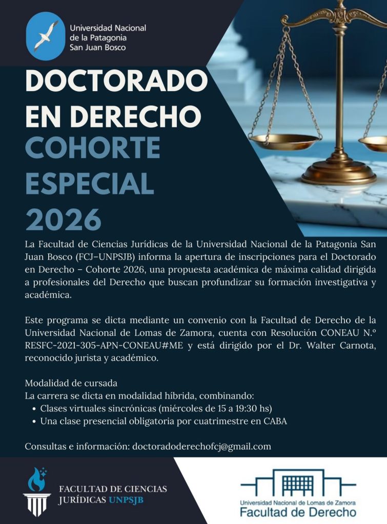 En el marco de los convenios firmados oportunamente entre el Superior Tribunal de Justicia de Chubut y La Facultad de Ciencias Jurídicas de la Universidad Nacional de la Patagonia San Juan Bosco (FCJ–UNPSJB), se informa que dicha institución académica ha habilitado las inscripciones para el Doctorado en Derecho (cohorte 2026).