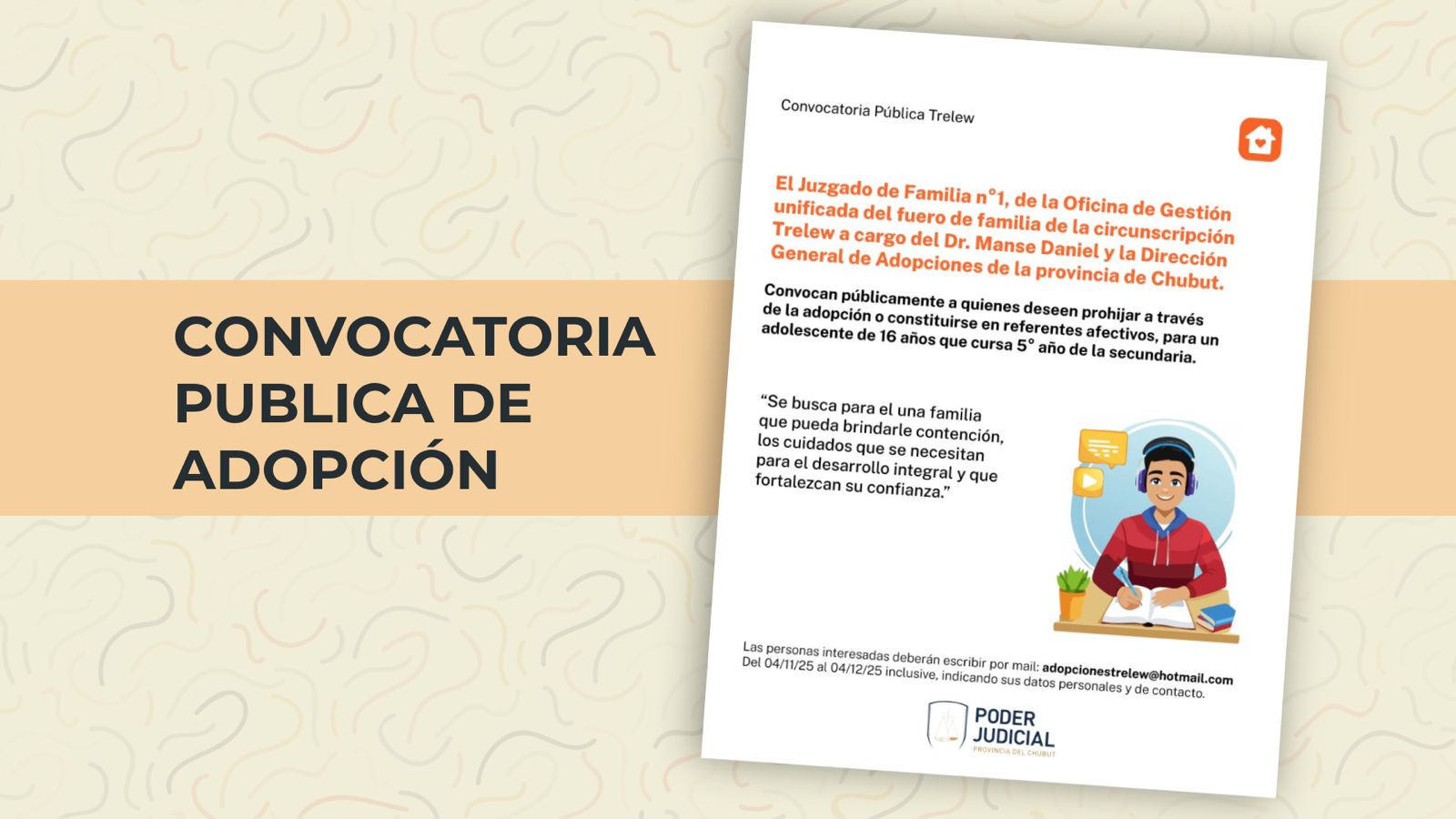 El Juzgado de Familia N° 1 de la Oficina de Gestión Unificada del fuero de familia de la Circunscripción Judicial Trelew, a cargo del Dr. Daniel Manse, y la Dirección General de Adopciones de la Provincia del Chubut convocan de manera pública a quienes deseen prohijar a través de la adopción o constituirse en referentes afectivos, para un adolescente de 16 años que cursa 5° año de la secundaria.