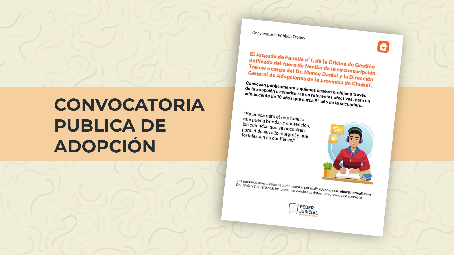 Convocan de manera pública a quienes deseen prohijar a través de la adopción o constituirse en referentes afectivos, para un adolescente de 16 años que cursa 5° año de la secundaria.