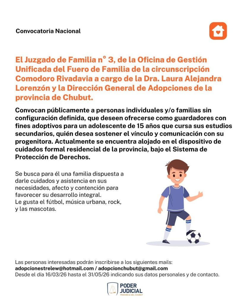El Juzgado de Familia N° 3, de la Oficina de Gestión Unificada del Fuero de Familia de la Circunscripción Comodoro Rivadavia, a cargo de la Dra. Laura Alejandra Lorenzón y la Dirección General de Adopciones de la Provincia del Chubut