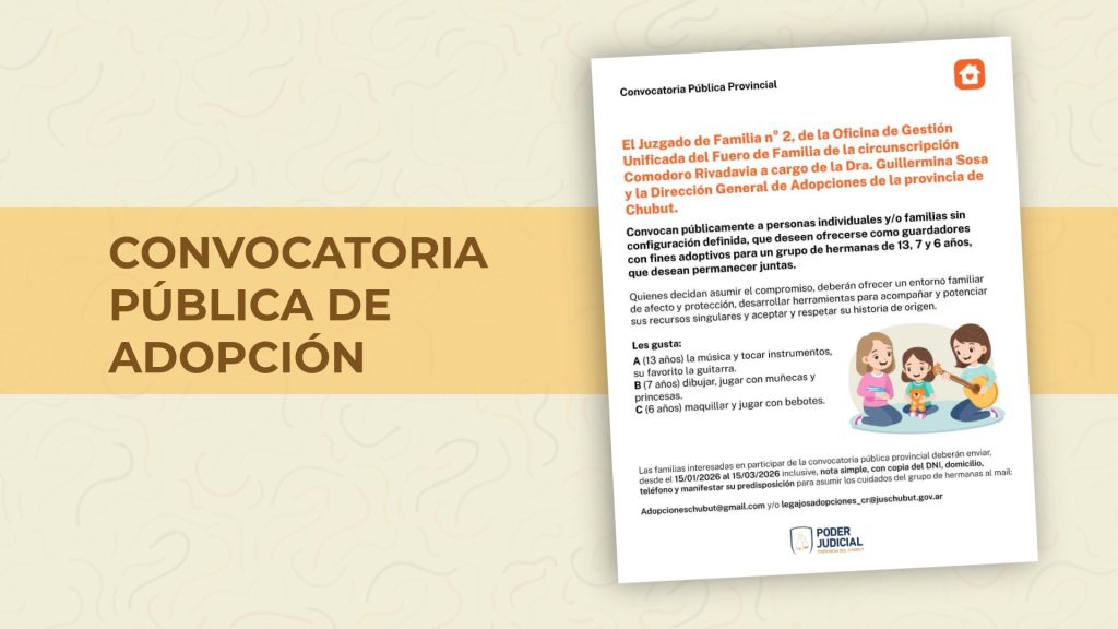 Las personas interesadas podrán inscribirse en los siguientes mails: adopcionescomodororivadavia@gmail.com / legajosadopciones_cr@juschubut.gov.ar desde el día 15/01/2026 al 6/03/2026 indicando sus datos personales y de contacto.