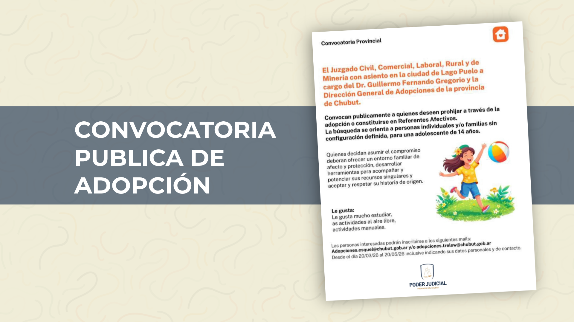 El Juzgado Civil, Comercial, Laboral, Rural y de Minería con asiento en la ciudad de Lago Puelo, a cargo del Dr. Guillermo Fernando Gregorio y la Dirección General de Adopciones de la Provincia del Chubut