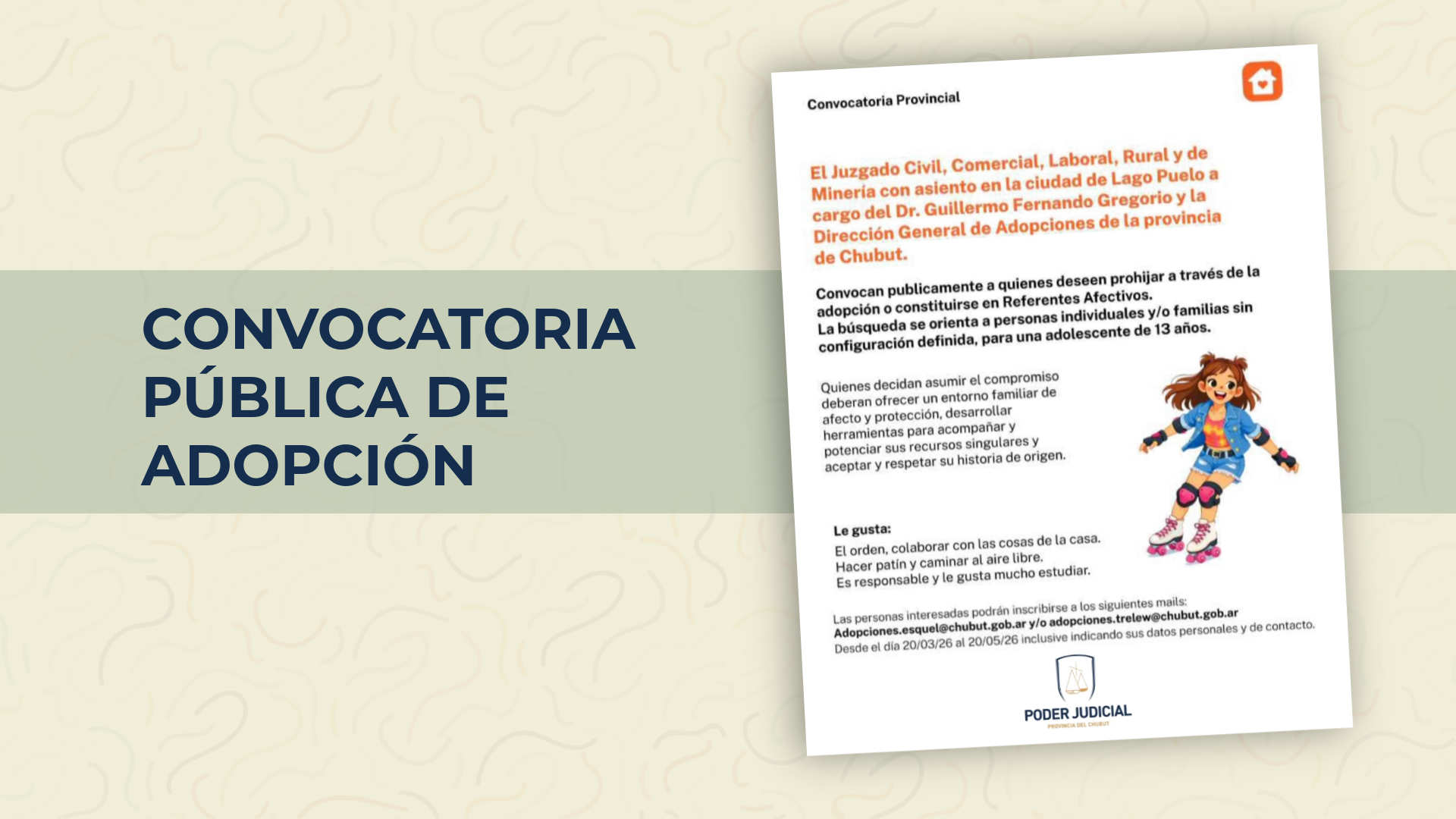 El Juzgado Civil, Comercial, Laboral, Rural y de Minería con asiento en la ciudad de Lago Puelo, a cargo del Dr. Guillermo Fernando Gregorio y la Dirección General de Adopciones de la Provincia del Chubut