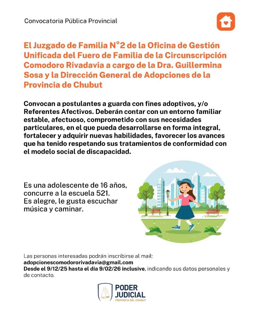 El Juzgado de Familia N° 2 de la Oficina de Gestión Unificada del Fuero de Familia de la Circunscripción Comodoro Rivadavia, a cargo de la Dra. Guillermina Sosa y la Dirección General de Adopciones de la Provincia de Chubut