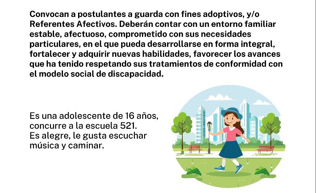 Convocan a postulantes a guarda con fines adoptivos y/o referentes afectivos. Deben contar con un entorno familiar establece, afectuoso, comprometido con sus necesidades particulares, en el que pueda desarrollarse en forma integral, fortalecer y adquirir nuevas habilidades, favorecer los avances que ha tenido, respetando sus tratamientos de conformidad con el modelo social de discapacidad.