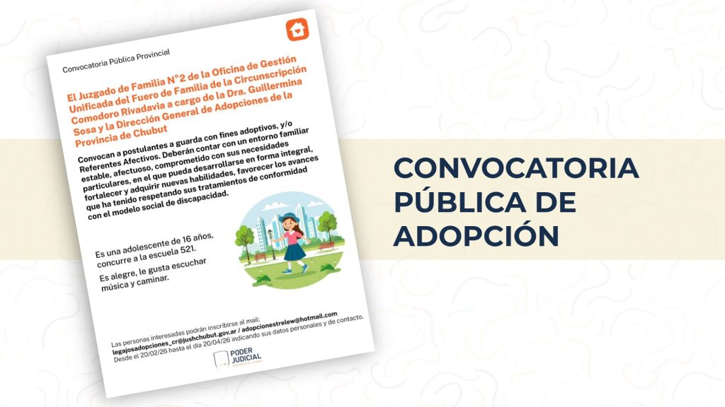 El Juzgado de Familia N° 4 de la Oficina de Gestión Unificada del Fuero de Familia de la Circunscripción Judicial Comodoro Rivadavia, a cargo del Dr. Pablo José Pérez y la Dirección General de Adopciones de la Provincia del Chubut, convocan a quienes desean prohijar a través de la adopción o constituirse en referentes afectivos, para una niña de 10 años.