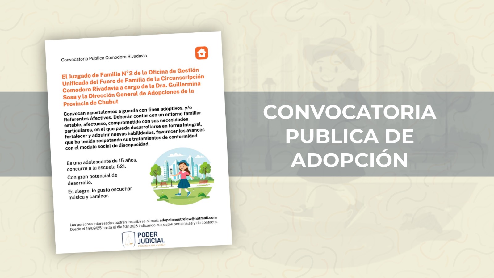 El Juzgado de Familia N° 2 de la Oficina de Gestión Unificada del Fuero de Familia de la Circunscripción Comodoro Rivadavia, a cargo de la Dra. Guillermina Sosa, y en el marco del Registro Único de Aspirantes a Guardas con Fines Adoptivos de la Provincia del Chubut, convoca a personas individuales y/o familias sin configuración definida que deseen ofrecerse como guardadores con fines adoptivos para una adolescente de 15 años.