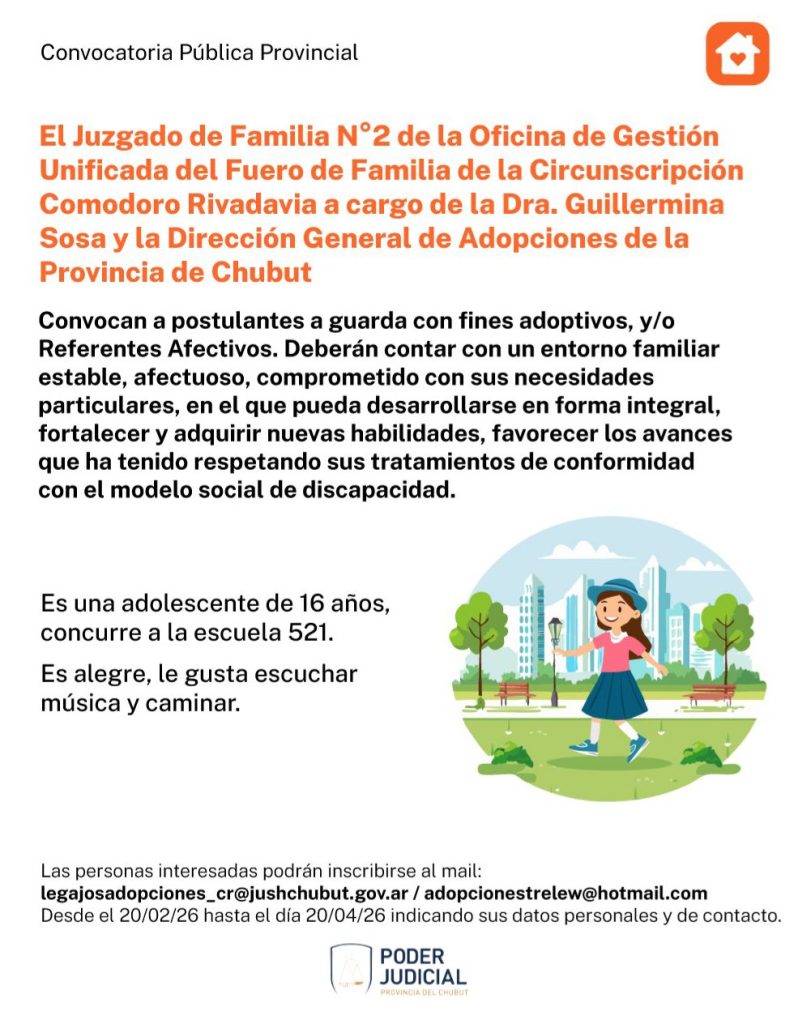 Las personas interesadas podrán inscribirse al mail: legajosadopciones_cr@juschubut.gov.ar / adopcionestrelew@hotmail.com desde el 20/02/2026 hasta el día 20/04/2026 indicando sus datos personales y de contacto.