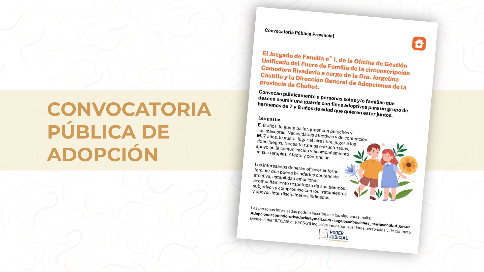 Las personas interesadas podrán inscribirse a los siguientes mails: Adopcionescomodororivadavia@gmail.com / legajosadopciones_cr@juschubut.gov.ar desde el día 16/03/2026 al 16/05/2026 inclusive, indicando sus datos personales y de contacto.