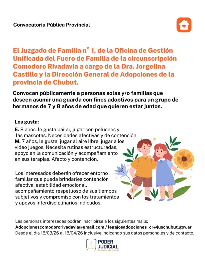 El Juzgado de Familia N° 1 de la Oficina de Gestión Unificada del Fuero de Familia de la Circunscripción Comodoro Rivadavia, a cargo de la Dra. Jorgelina Castillo y la Dirección General de Adopciones de la Provincia del Chubut