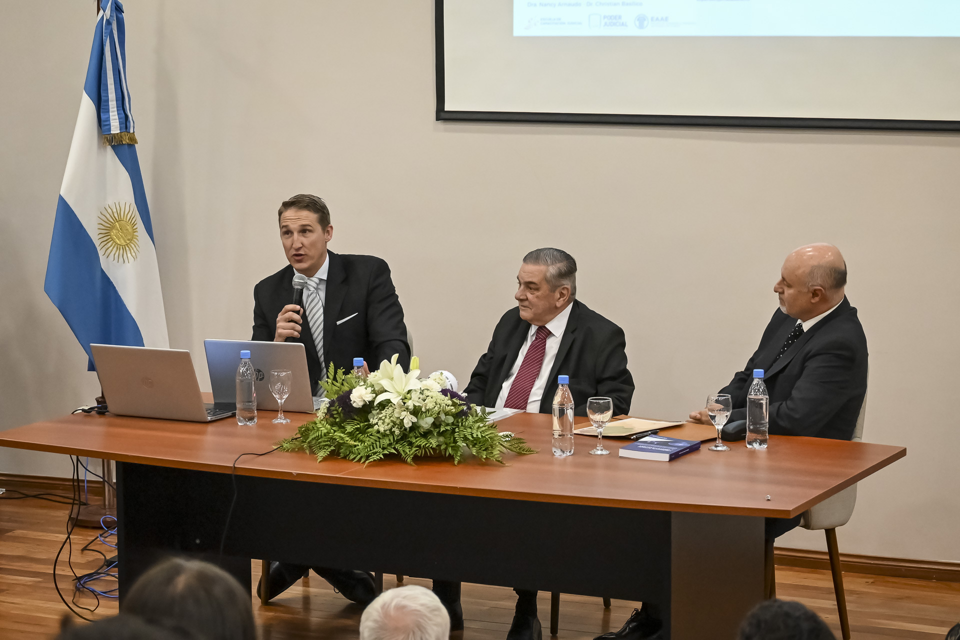 La apertura del encuentro estuvo a cargo del Dr. Andrés Giacomone, Ministro del Superior Tribunal de Justicia de Chubut, junto a la Dra. Florencia Cordón Ferrando y el Dr. Fernando Shina, integrantes del comité organizador, junto a la Escuela de Capacitación Judicial del STJ (ECJ) y la Escuela de Abogados y Abogadas del Estado (EAAE).