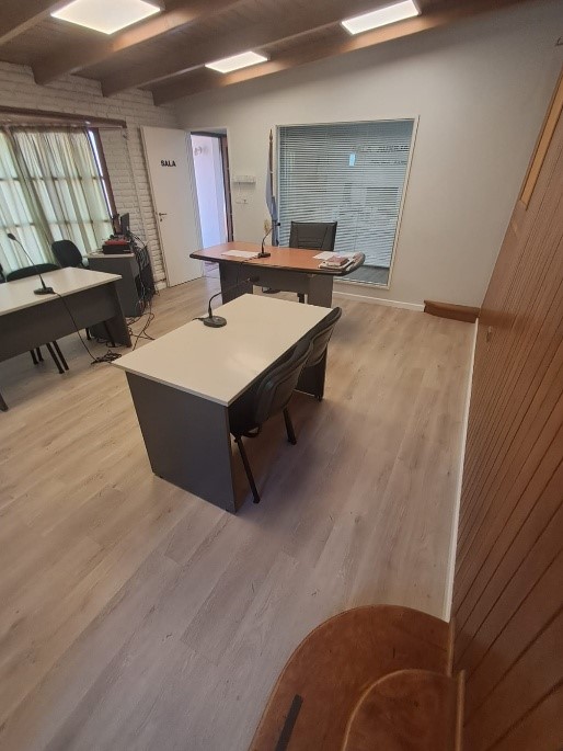 De manera paralela, se finalizaron las tareas exteriores correspondientes al nuevo acceso a la sala de audiencias, cuya habilitación está programada para marzo de 2026. En el exterior, se realizaron adecuaciones y la instalación de solados de pórfido, lo que ha mejorado notablemente la accesibilidad desde el exterior, así como la circulación interna entre los diferentes organismos que funcionan en el edificio.