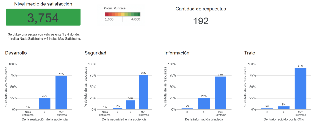 Durante los años 2024 y 2025 se recibieron casi 200 respuestas de personas que participaron como jurados en juicios celebrados en todas las circunscripciones, manifestando un alto nivel de satisfacción respecto del desarrollo y seguridad de la audiencias como así también del trato y la información recibida.